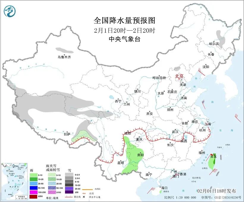 中央气象台预计,2月1日20时至2日20时,西藏西部北部和东部、青海南部、黑龙江中部等地部分地区有小雪或雨夹雪,其中,西藏西南部局地有中雪。云南东南部、广西西部、贵州西部、台湾岛等地部分地区有小雨,其中,台湾岛北部和东部等地部分地区有中雨。