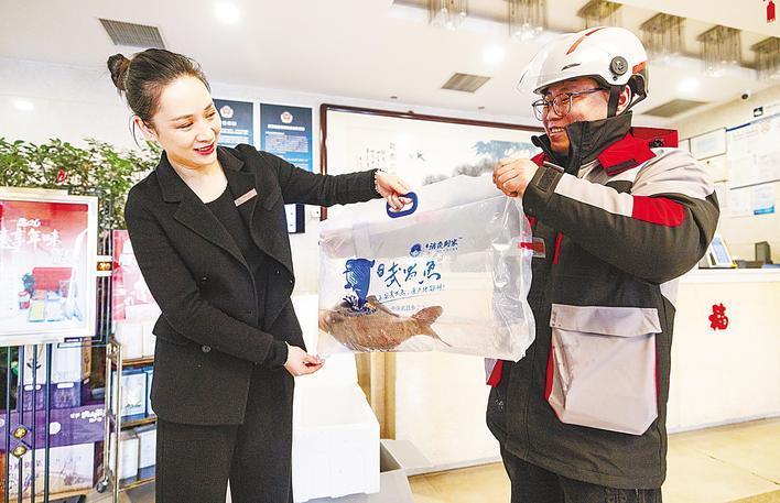 长途运输中保持鱼的鲜活,关键在包装。记者看到,工作人员将特制塑料袋注入半袋水、充满氧气,再将沥干水的鱼滑入袋中,二次充氧、密封入箱。“这袋子防刺耐压,鱼在里面能活72小时。”孟辉说。