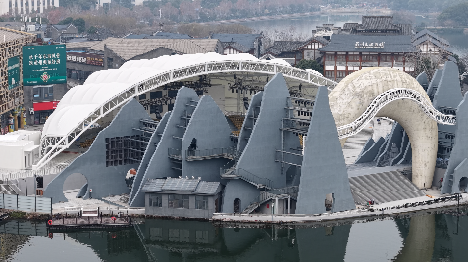 舞台之外,细节之处尽显用心。后台新建的各类功能间,为演艺人员提供了专业保障;湖边新增的码头,未来将连接夜游与观演,打开“泛舟至剧场”的浪漫通道;而那在非演出日也会亮起的舞台灯带,将与城市夜景交融,让剧场成为遗爱湖畔一道不落幕的风景。