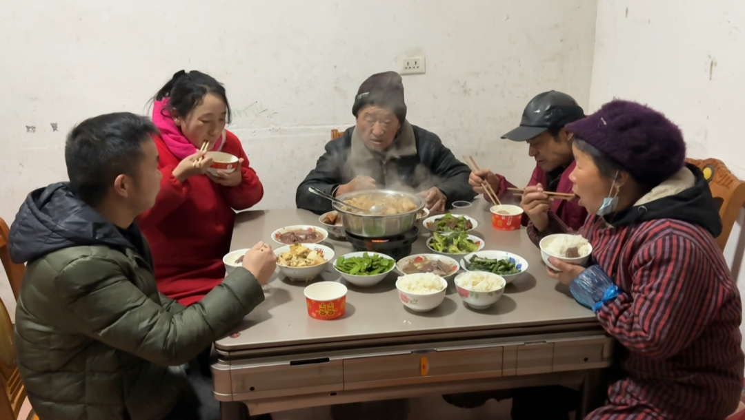 夜色渐深,小院里的火锅咕嘟作响,热气裹着浓郁的肉香弥漫满院,瞬间驱散了冬日的寒意。主人家特意请吴绪珍上座,斟上一杯温热的白酒,道一声辛苦,敬一年的收成,也敬这份难得的邻里情谊。