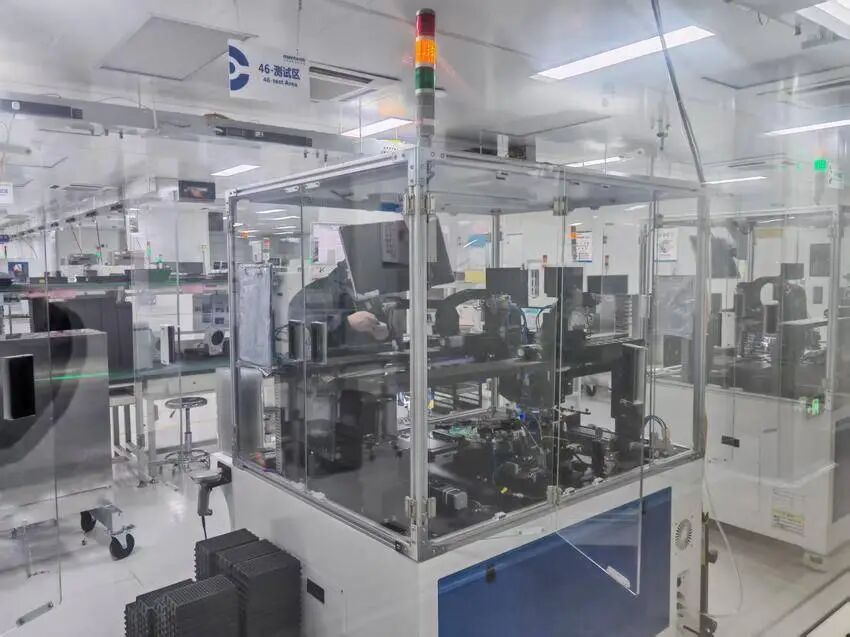铭普光通崭新的十万级无尘车间内,10多条半导体激光器全自动封装生产线全力运转,机械手精准抓取、转运物料,动作流畅而高效;20余名穿着专业无尘服和防静电鞋的工人来回巡视检查,每一个动作都规范细致、一丝不苟。车间顶部的LED屏上,实时显示着当日产能、合格率等关键数据,各项指标均保持在高位水平,彰显着企业高效运转的强劲活力。
