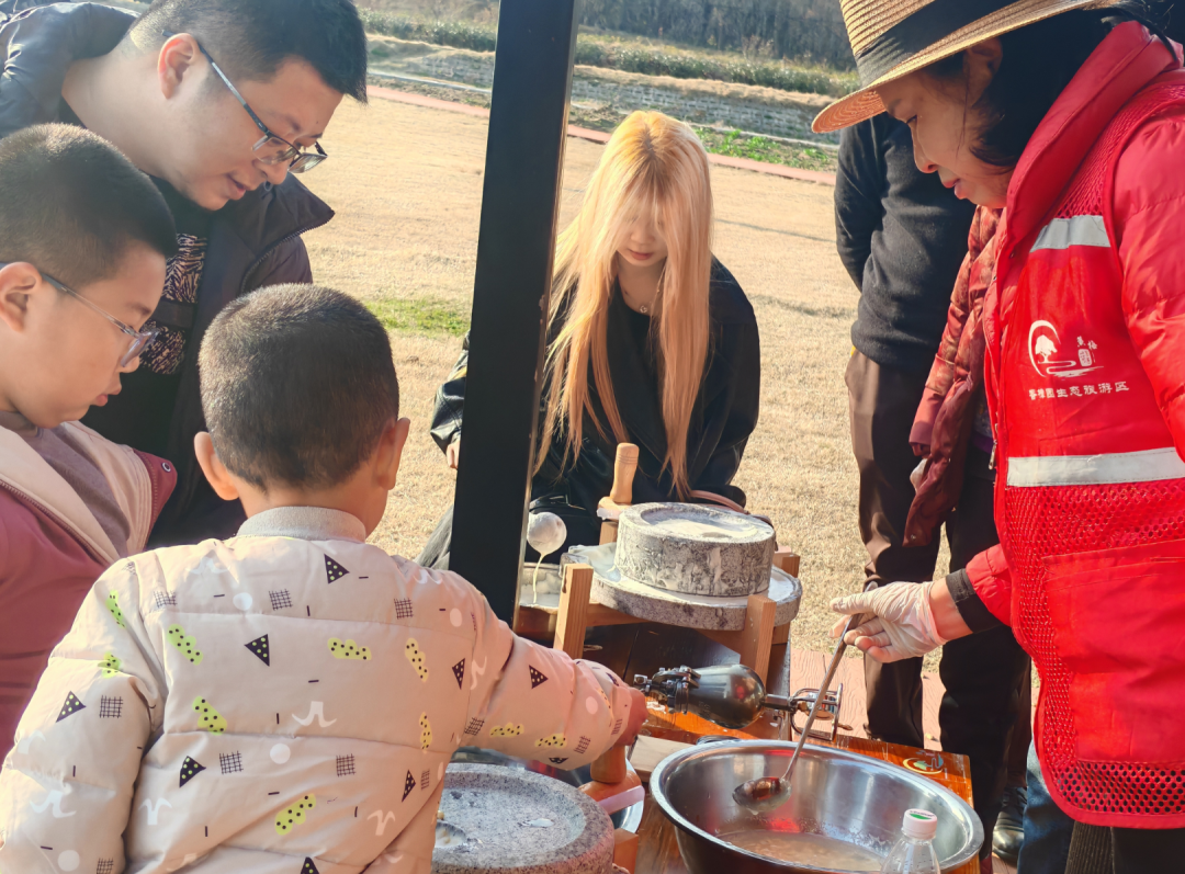 走进景区,成片的香樟林被红灯笼、中国结点缀得喜气洋洋。林间空地上,打糍粑、做豆丝、炸元宵等黄梅传统年俗活动轮番上演,游客们不仅可以围观,更能亲手体验。“好多年没打过糍粑了,这次带着孩子一起体验,让他也感受一下我们小时候过年的味道。”本地游客王先生一边挥动木槌一边笑着说。