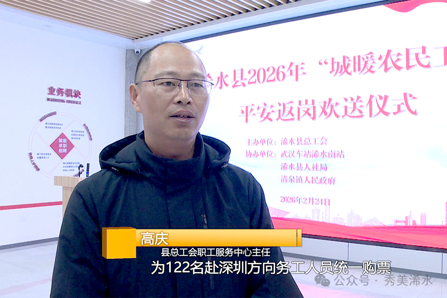 浠水县总工会职工服务中心主任 高庆:我县是务工大县,年前县总工会联合武汉车站和浠水南站等部门,筹措资金近10万元,为122名赴深圳方向务工人员统一购票,并送上了矿泉水、方便食品等物资。下一步,县总工会将继续当好职工“娘家人”,扩大服务覆盖面,全力保障浠水籍务工人员平安返岗、安心务工。