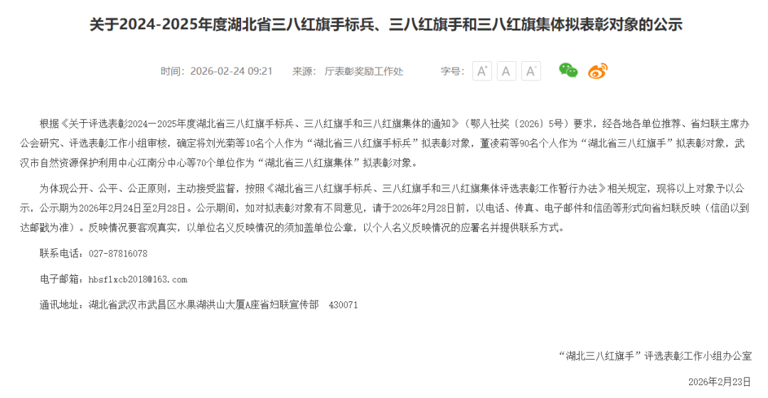日前,湖北省人社厅发布公示,确定2024-2025年度湖北省三八红旗手标兵、三八红旗手和三八红旗集体拟表彰对象。
