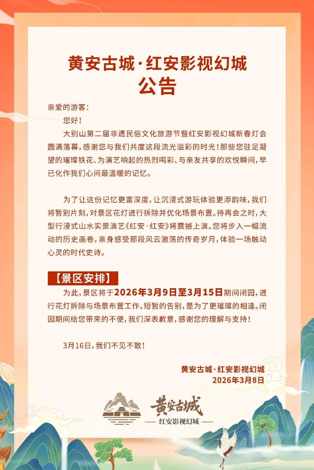 注意啦,黄安古城·红安影视幻城发布公告,3月9日至3月15日园区将闭园进行维护更新,期间暂停对外开放想去游玩的游客朋友们别跑空!