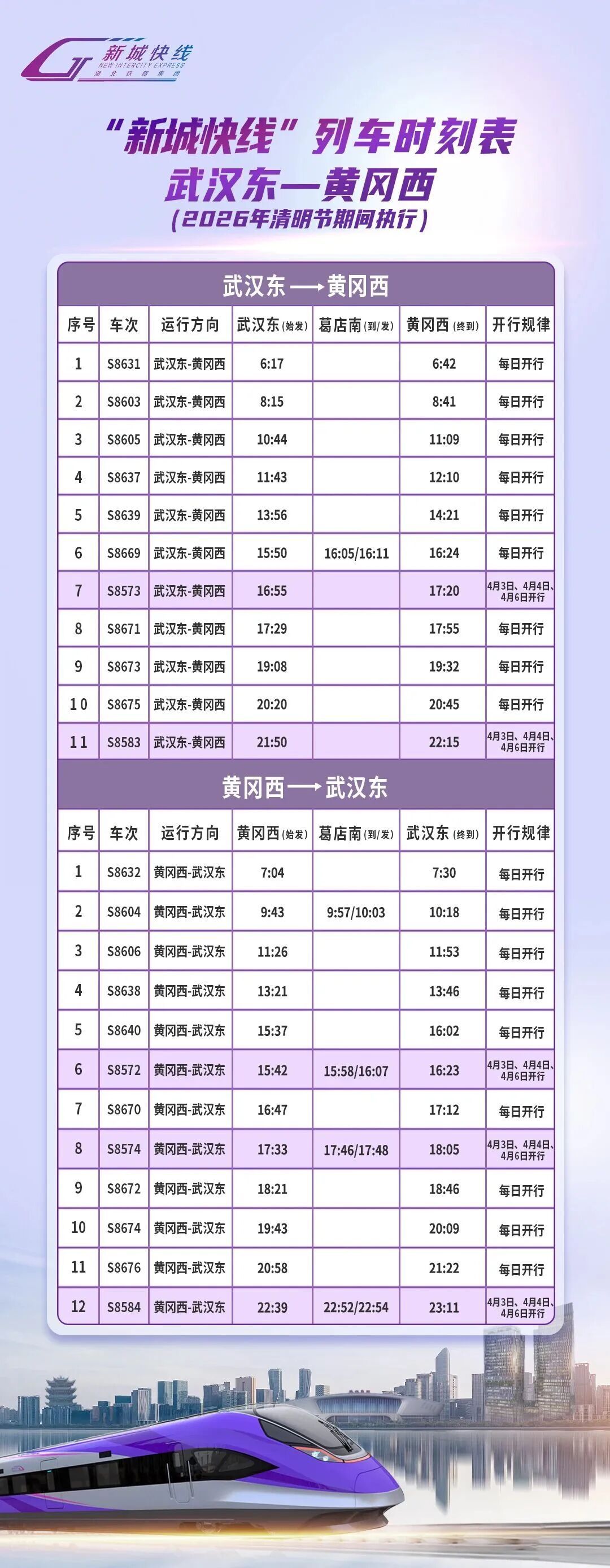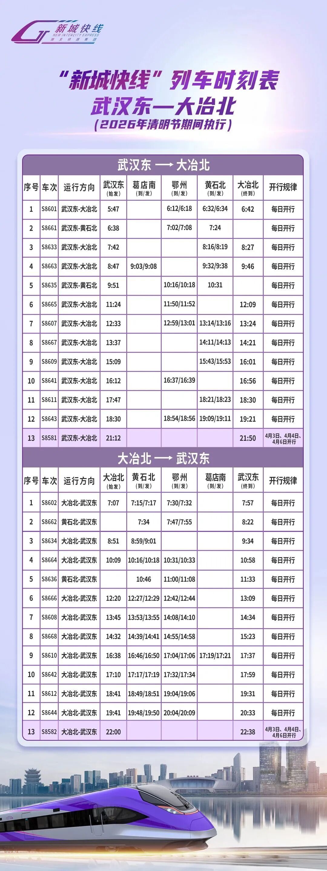 2026年4月3日、4月4日和4月6日, “新城快线”将按49列/日开行,新增假日临时列车7列/日,其中武汉东至大冶北方向1列,大冶北至武汉东方向1列;武汉东至黄冈西方向2列,黄冈西至武汉东方向3列。