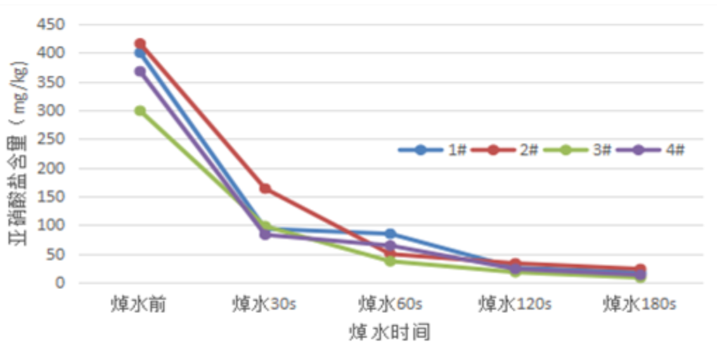浙江省宁波市产品食品质量检验研究院食品安全检验中心技术人员曾开展实验,分别对香椿进行焯水30秒、60秒、120秒、180秒处理,检测焯水时长对亚硝酸盐含量的影响。