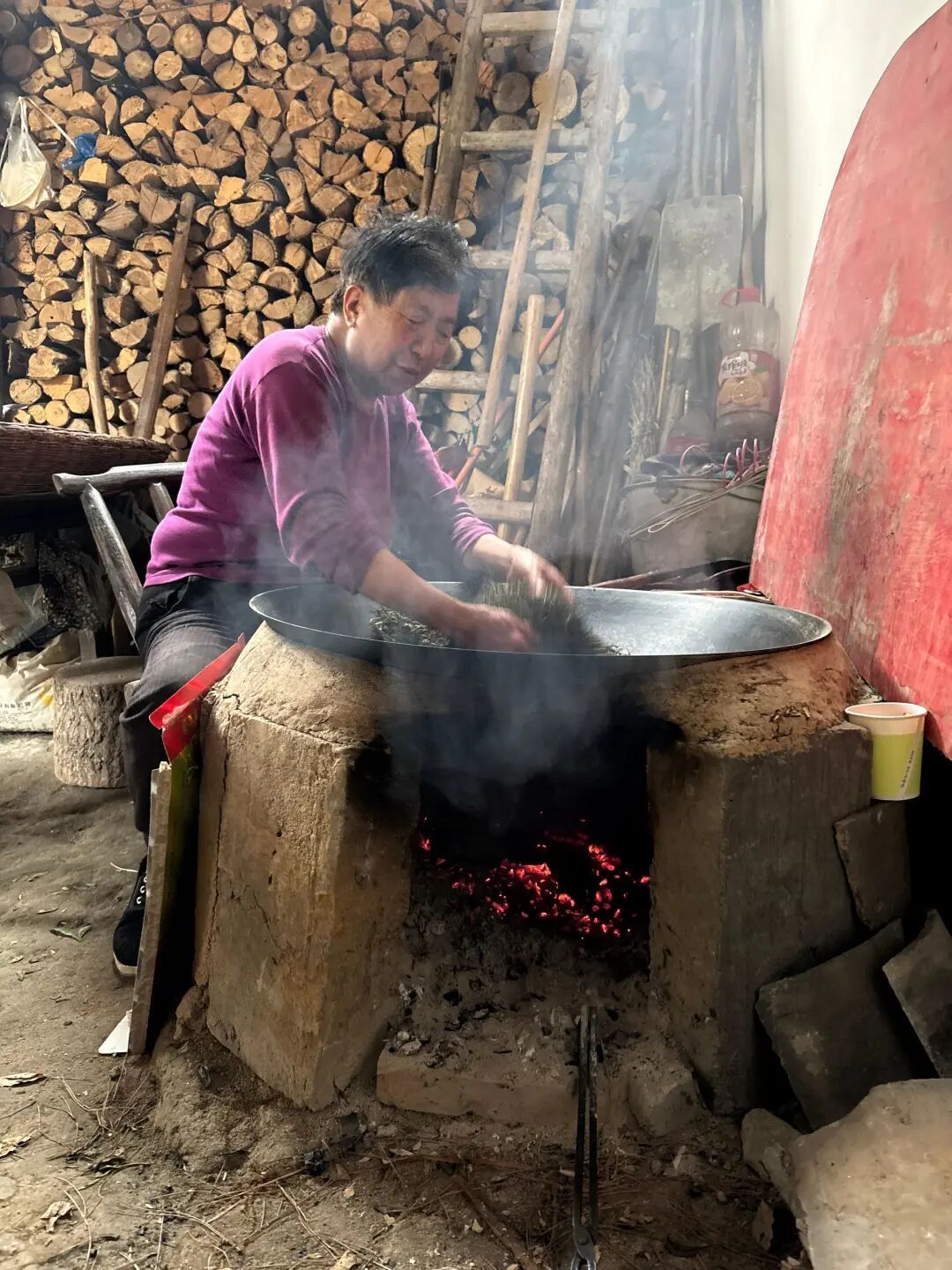 为了保证出品,连炒茶烧火用的材料也是她自己准备的:煮饭时,把未烧尽的木头闭熄,形成一些类似黑色小火炭的火匙,可以很容易点燃,也容易控制温度。“要揉三道,炒三道,这样的茶叶才经泡,才好喝。”彭明菊说。