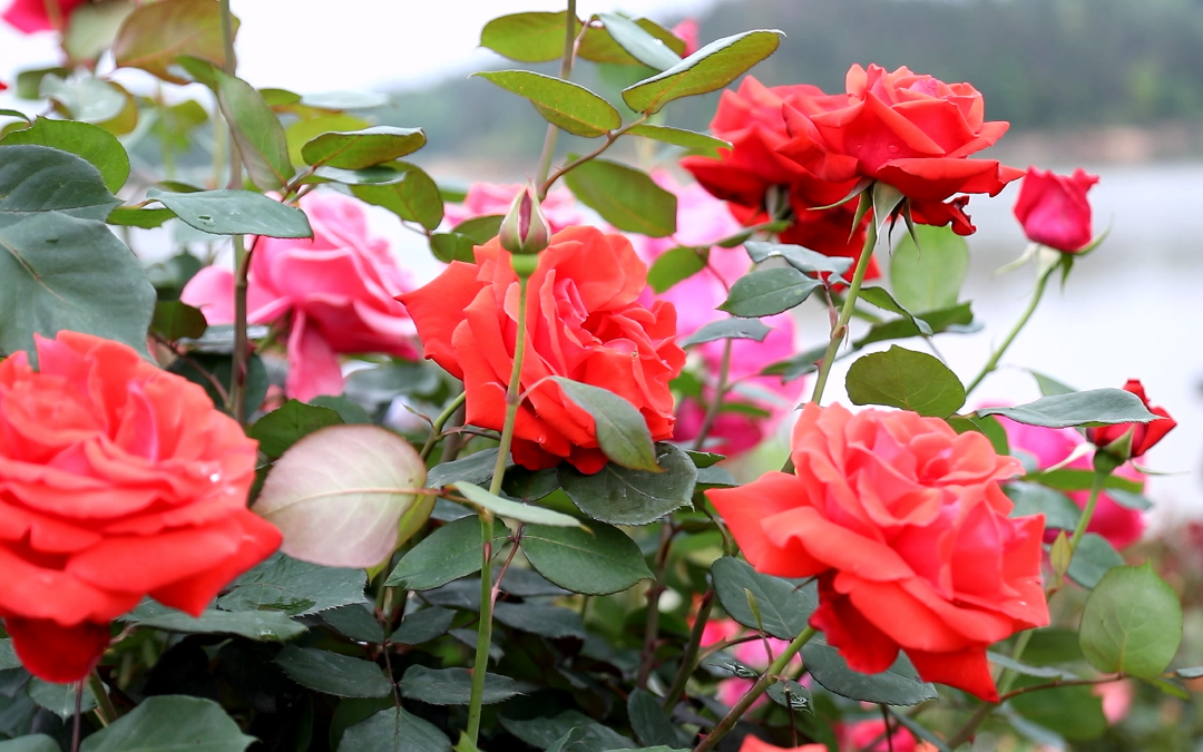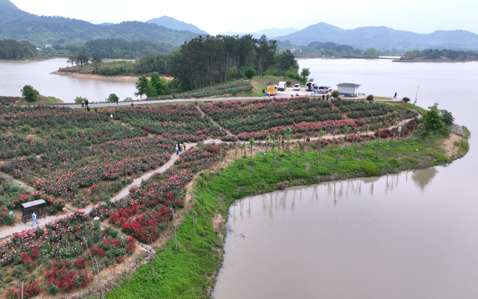 4月21日,走进东岳花海,仿佛踏入了一幅流动的油画。月季与玫瑰竞相绽放,红的似火、粉的如霞,与碧波万顷的牛车河水库交相辉映。