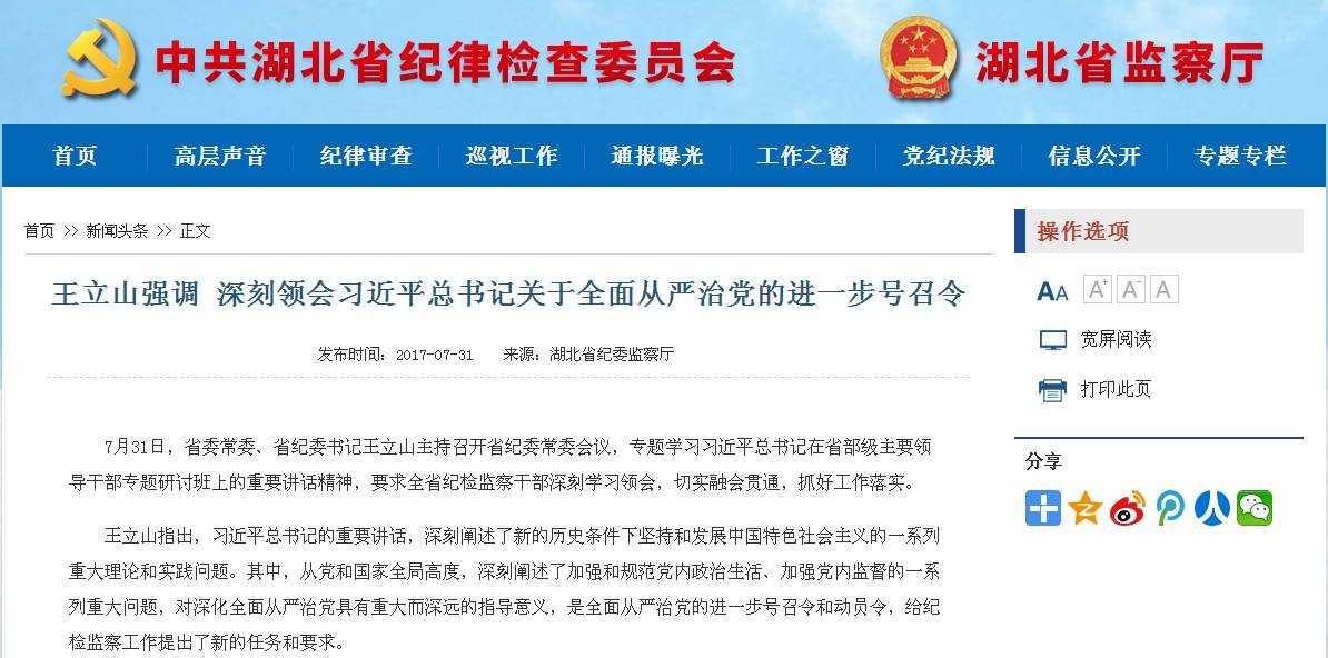 王立山要求,全省纪检监察干部要切实增强“四个意识”,自觉同以习近平同志为核心的党中央保持高度一致。要自觉服务大局,始终把纪检工作放在党的工作全局中谋划、部署和推动,为实现伟大梦想和开启湖北“建成支点 走在前列”新征程提供坚强保障。要进一步加大工作力度,努力把湖北全面从严治党的思路举措搞得更加科学、更加严密、更加有效,以优异成绩迎接党的十九大胜利召开。(记者 杨宏斌 通讯员 赵宁)
