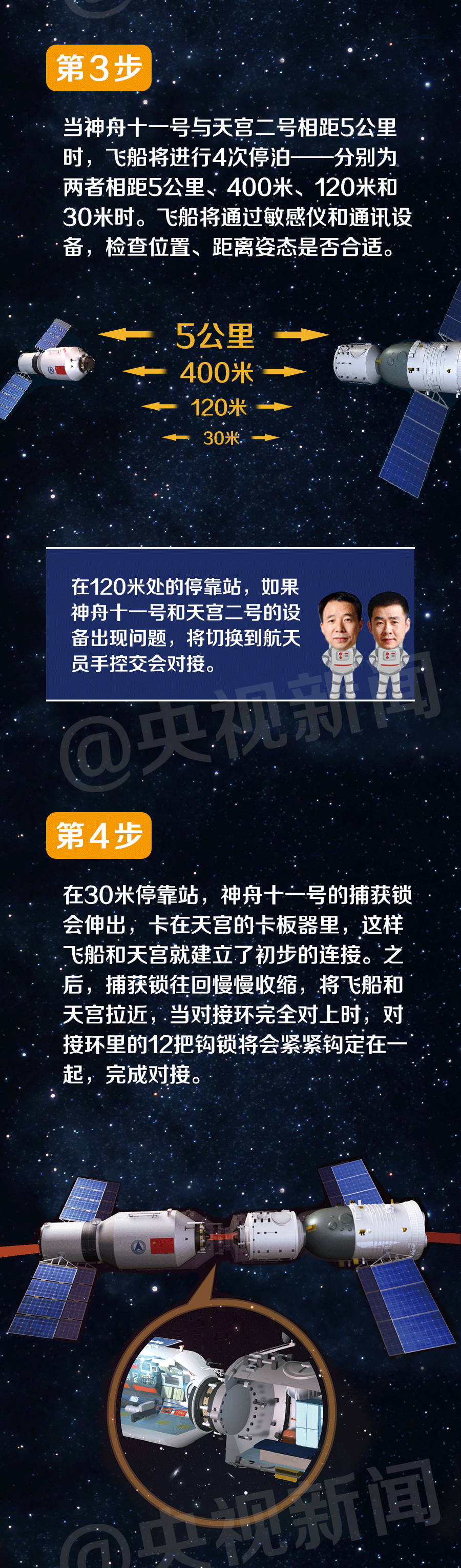 在今天交会对接形成组合体后,航天员进驻天宫二号,组合体在轨飞行30天。其间,两名航天员将按照飞行手册、操作指南和地面指令进行工作和生活,按计划开展有关科学实验。