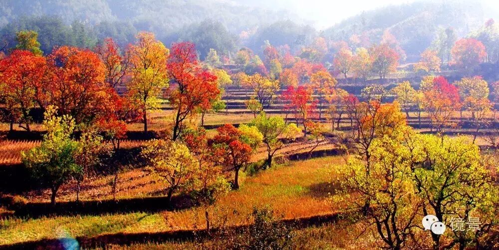 清晨,揉着激动一夜并不敢深睡的眼睛,披着厚厚的晨雾,在晨曦里再次走向田园里的红叶。乳白色的雾飘带一般在眼前游移,草尖上的露珠湿润得空气也凉沁彻骨,这时,你就像那千年的林妖,带着木梓一样亮闪闪的精魂,带着千年红叶的呼唤,梦幻一般在田野里嬉戏,漫步。如梦如幻,如神如仙,你分不清哪是你,哪是红叶,还有身边的溪水、田园、山村。太阳从大山顶上慢慢抬起头来,天堂睡佛也几乎在展眉伸腰,周围的一切轮廊渐次分明,你在薄雾晨里找回了自己,从千年中睡醒。