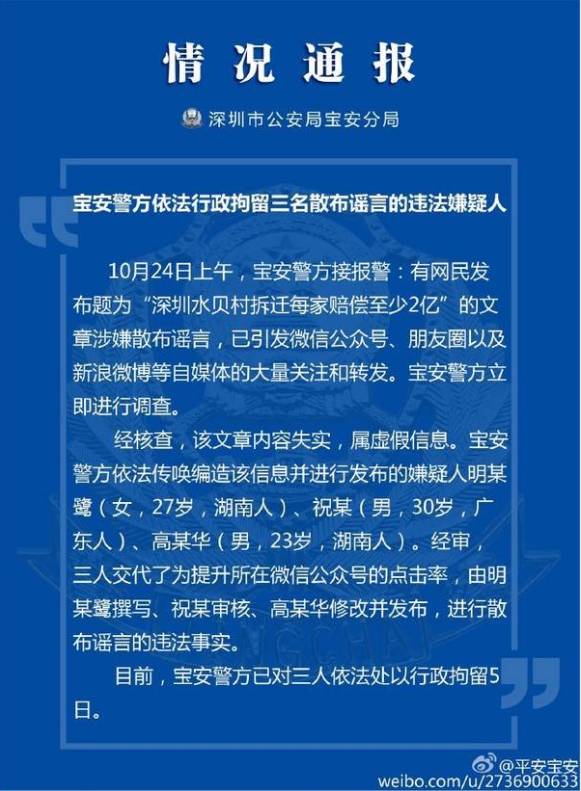 据深圳市公安局宝安分局官方微博消息,24日上午,宝安警方接报警:有网民发布题为“深圳水贝村拆迁每家赔偿至少2亿”的文章涉嫌散布谣言,已引发公众号、朋友圈以及微博等自媒体的大量关注和转发,宝安警方立即进行调查。经核查,该文章内容失实,属虚假信息。目前,警方已对三名嫌疑人依法处以行政拘留5日。