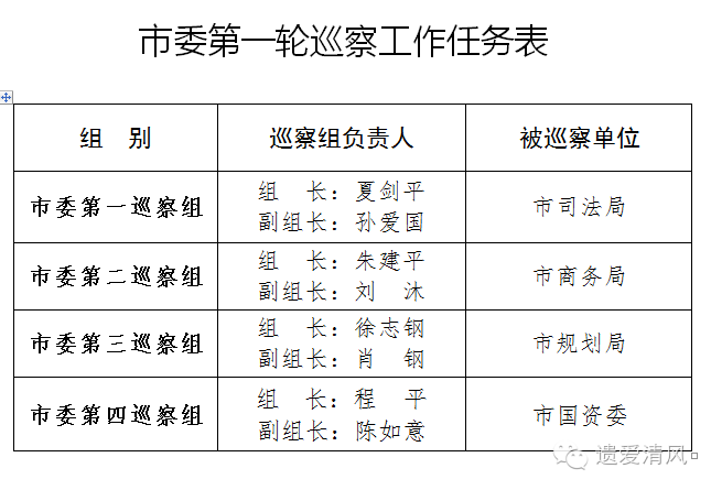 根据市委2016年第一轮巡察工作的安排,市委4个巡察组按照《中国共产党章程》和政治巡视巡察要求,深入贯彻党的十八大和十八届历次全会精神,习近平总书记系列重要讲话精神,以“四个意识”为标杆,以党章党规党纪为尺子,坚定政治方向,坚持问题导向,坚守价值取向,突出坚持党的领导,加强党的建设,聚焦全面从严治党,紧扣“六项纪律”,紧盯“三大问题”,从10月底开始对市司法局、市商务局、市规划局、市国资委进行巡察。