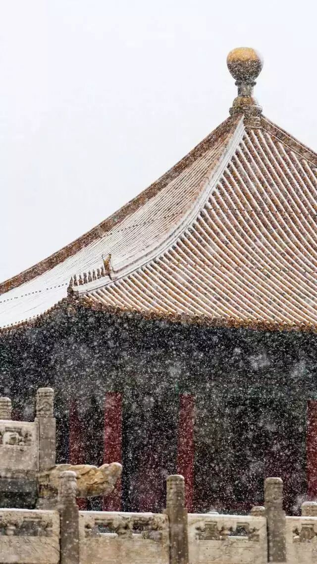 红墙白雪,碧瓦飞甍,数百年的厚重与静美,在片片雪花中绽放。