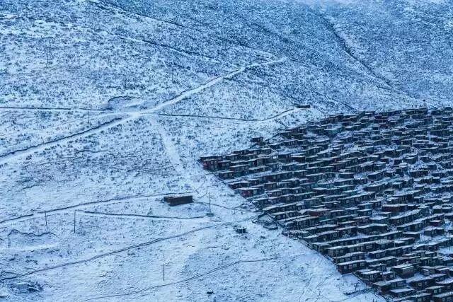 雪花飘落,没有如织的游人,没有喧闹的车马,色达的一切仿佛都得到了升华,万籁俱寂!