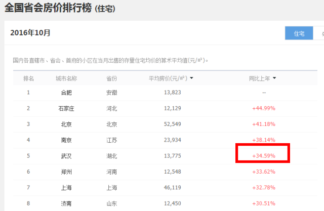 中国房价行情平台近日公布了10月31个省会城市(含4个直辖市)的住宅房价排行情况,武汉住宅均价是13775元/㎡,同比上年的涨幅为+34.59%,竟然仅次石家庄、北京、南京,位居第四!