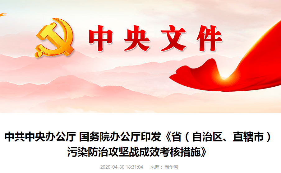 近日,中共中央办公厅、国务院办公厅印发了《省(自治区、直辖市)污染防治攻坚战成效考核措施》,并发出通知,要求各地区各部门结合实际认真贯彻落实。