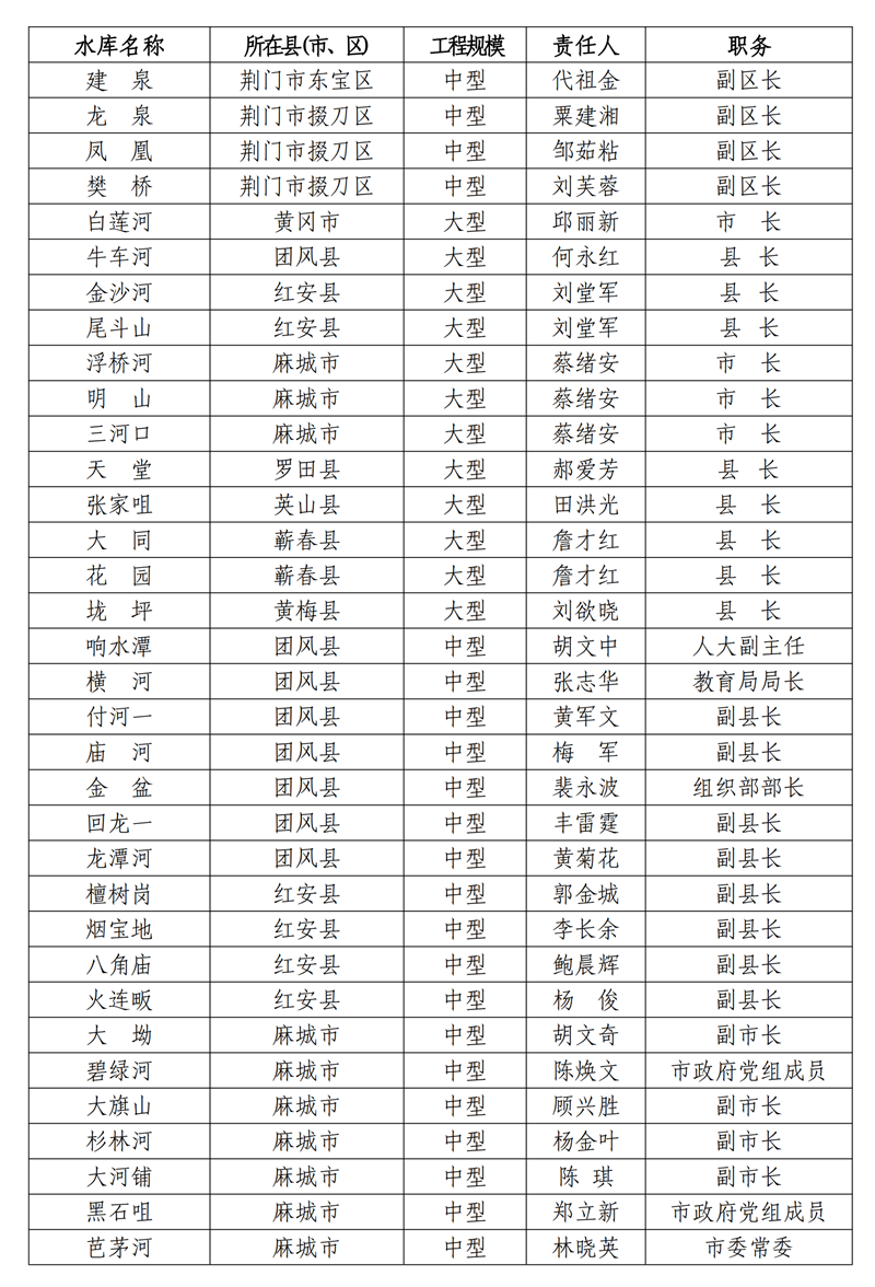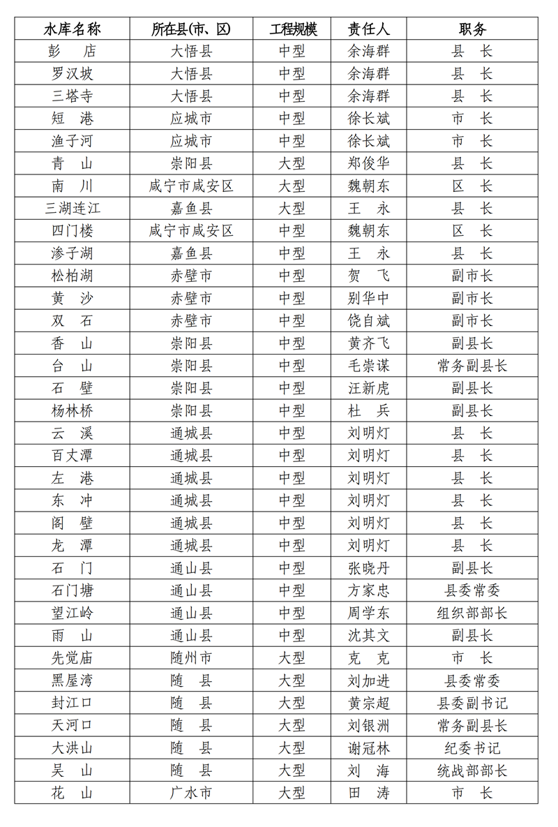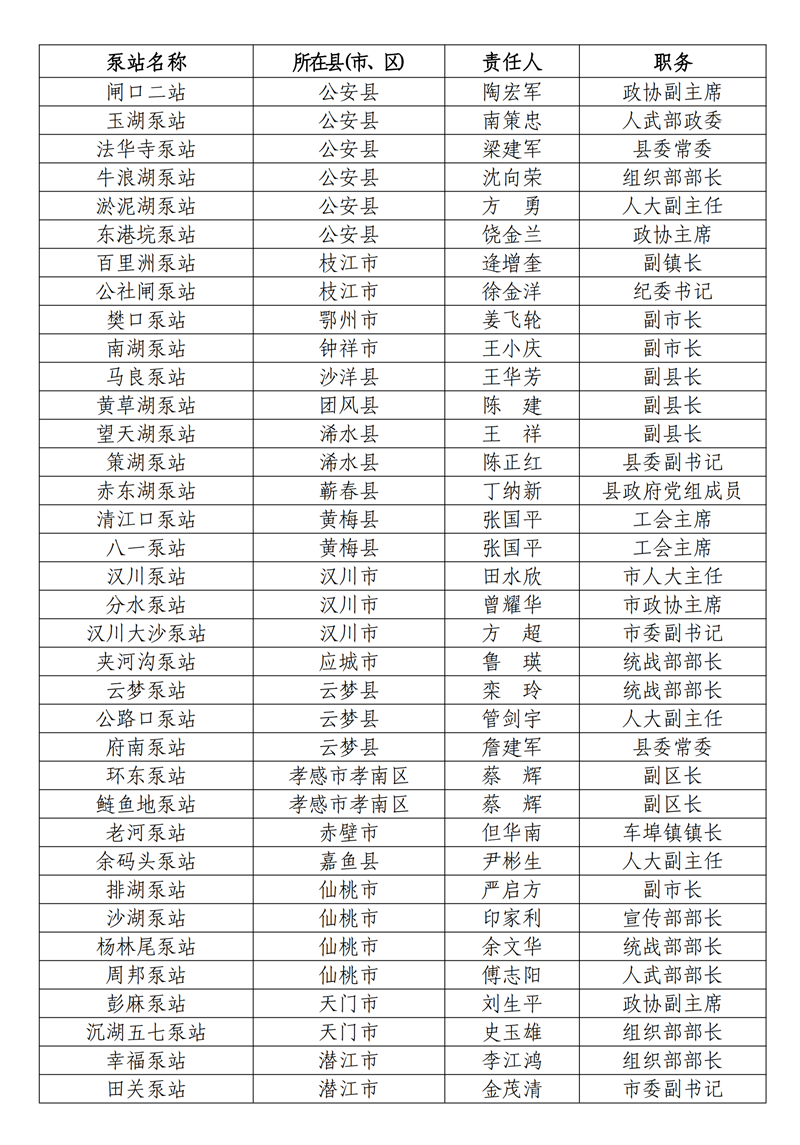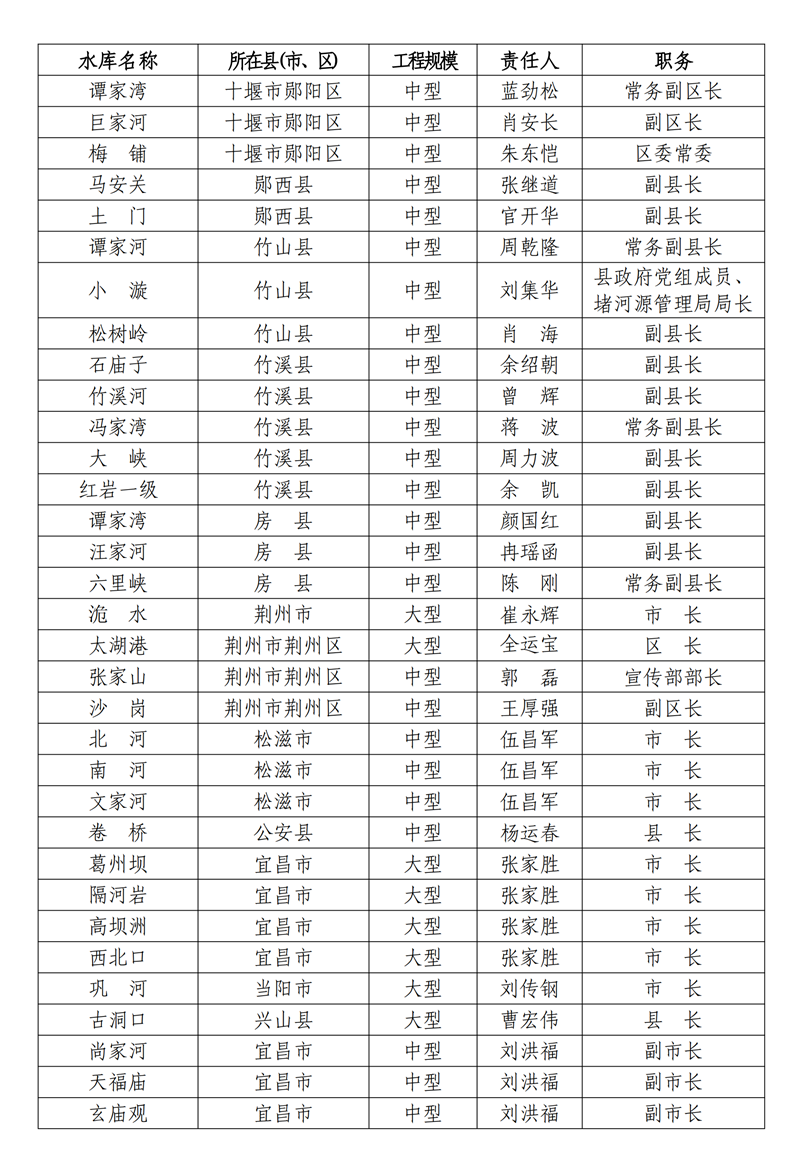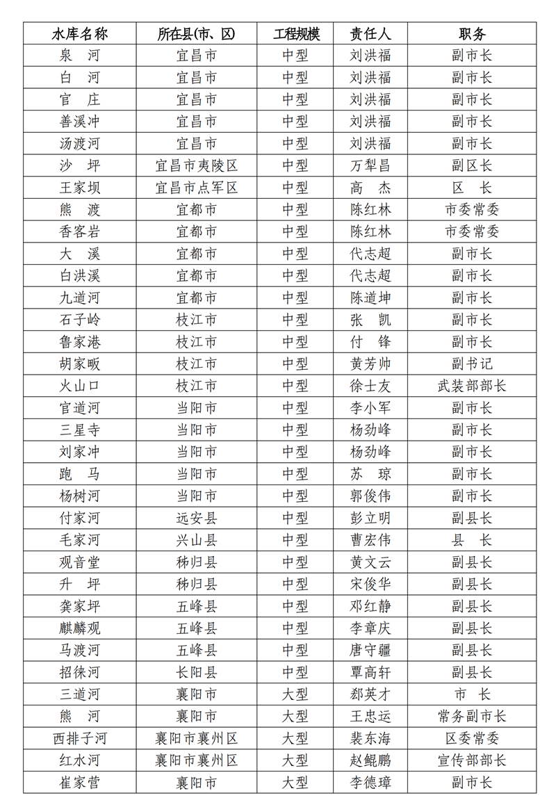 为切实做好2020年防汛抗旱工作,根据《中华人民共和国防洪法》《中华人民共和国防汛条例》《中华人民共和国抗旱条例》关于防汛抗旱工作实行各级人民政府行政首长负责制的规定,现将全省防汛抗旱行政责任人,大江大河、大中型水库、大型水闸、主要蓄滞洪区、大型排涝泵站、五大湖泊及重点防洪城市防汛行政责任人名单予以通报。责任人如有变动,原则上由其所在单位接任领导替补,并报省防指备案。