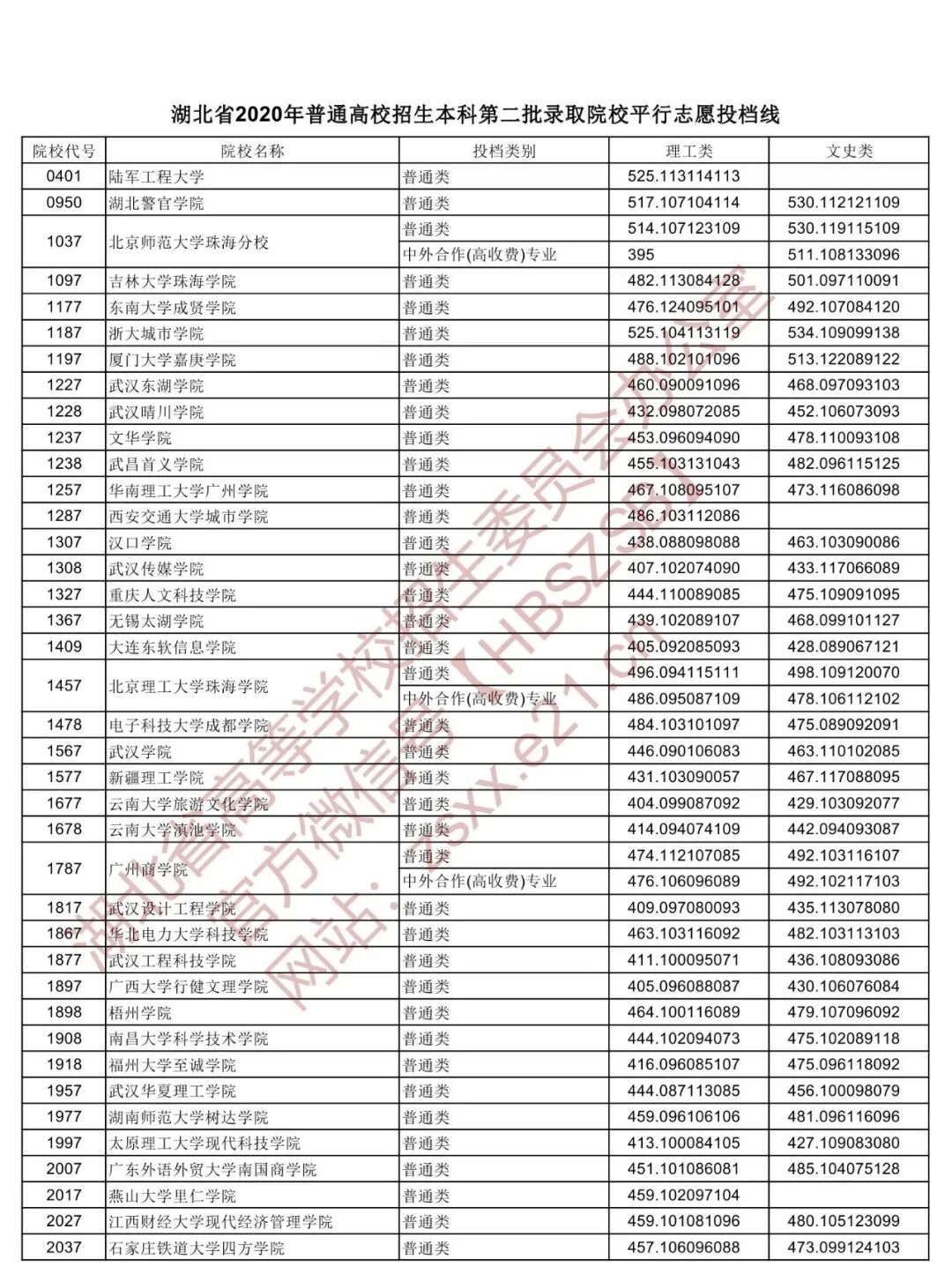 本科第二批录取院校平行志愿投档线