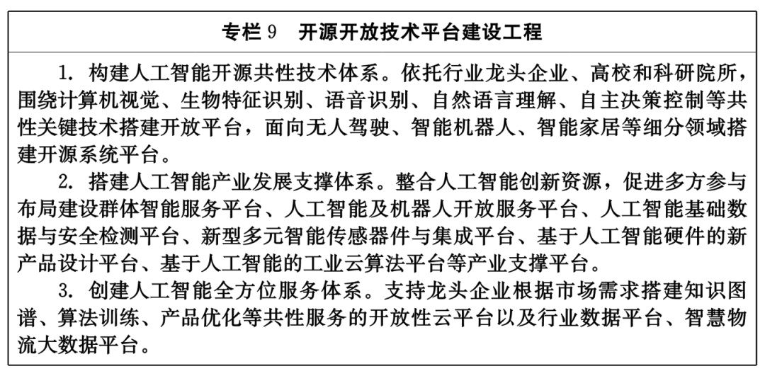整体提升人工智能行业创新支撑能力,有效降低中小微企业研发成本,支持企业联合高校、科研院所建设产学研用协同创新研发平台,搭建数据开放平台、开源开放共性技术平台,鼓励各类创新主体建设行业公共服务平台,促进人才要素等创新资源集聚。
