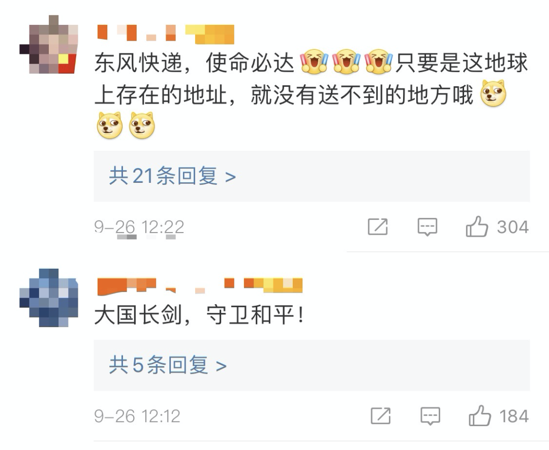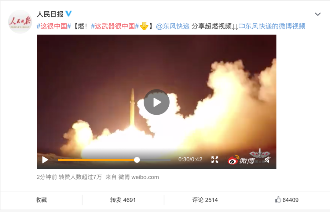 9月26日 人民号@东风快递 发布了一条视频: 这武器很中国! 来看一组燃图 ↓↓↓ 相关微博也很快冲上了热搜 不少网友盛赞: 这武器,的确很中国! 你被视频震撼到了吗? 来源:人民号@东风快递 ,综合北京日报 编辑:谢梓淇