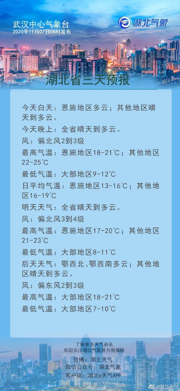 进入立冬节气,全省今天继续维持晴暖天气,气温将攀至近期的高峰,除恩施地区18-21℃,其他地区会升至22-25℃,午后略显燥热。