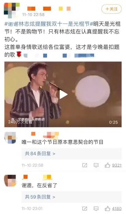 “不买人”的领路人或许就是演唱了《单身情歌》的林志炫,就连易烊千玺也在问你“买不”的时候,是他在认真提醒大家不忘光棍节的初心。