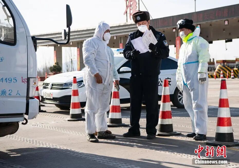 图为距离增村镇约4公里、距离小果庄村约8公里的一处疫情防控检查点,运送异地集中隔离观察人员的车辆通过此地。中新社记者 侯宇 摄