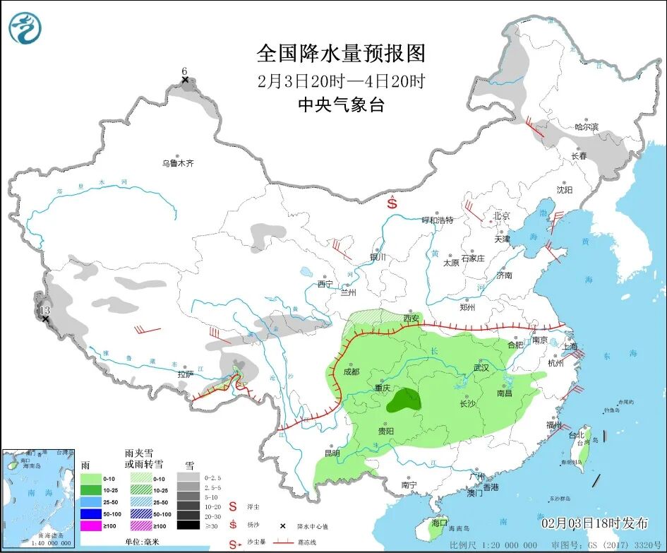 中央气象台预计,2月3日20时至4日20时,内蒙古东北部、吉林东部和西北部、川西高原北部、甘肃南部等地部分地区有小雪或雨夹雪。西藏中北部、浙江北部等地部分地区有6~7级风;内蒙古中西部有扬沙或浮尘天气。