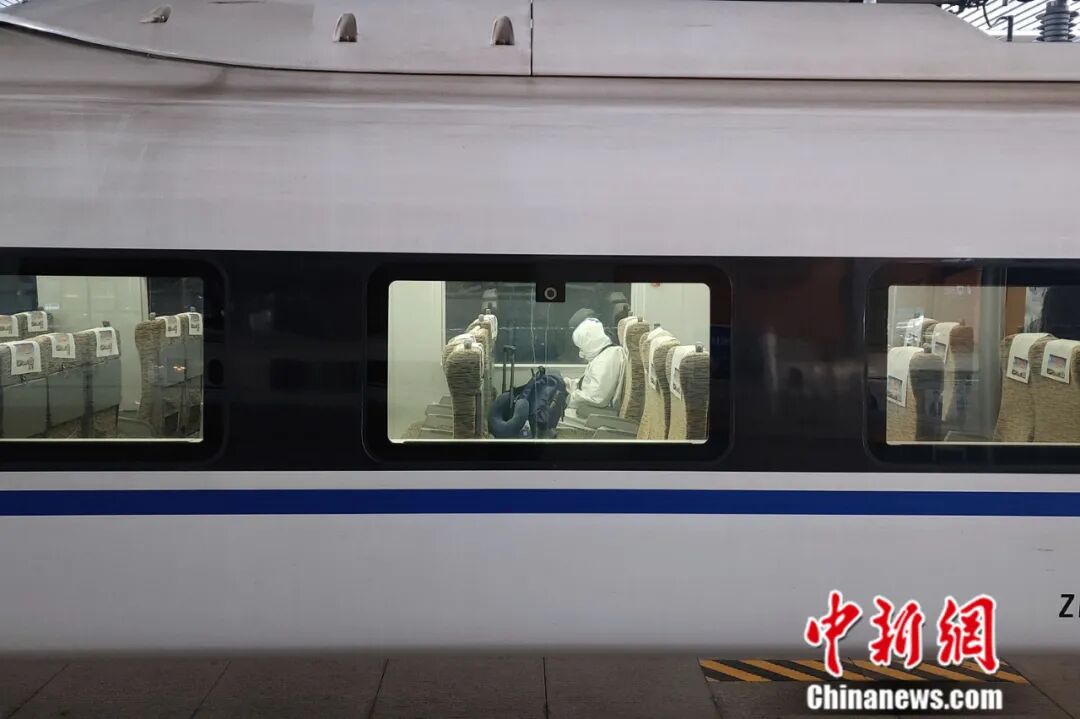 旅客穿着防护服乘坐高铁 孙磊 摄