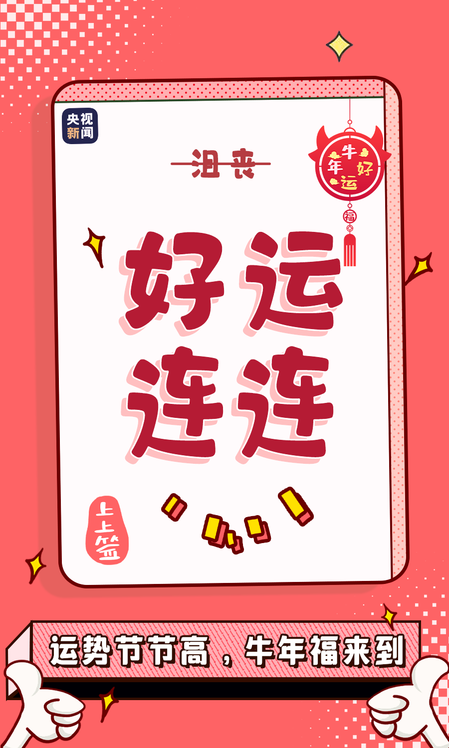 今天是农历正月初五,俗称“破五”,过了这一天,民间诸多禁忌皆可破,是一个辟邪除灾、迎福纳祥的节日。不同时代的人们总有不同的心愿,过去民间有“赶五穷”,近年网上流行“求好运”。下面一组牛年“迎福纳祥”心愿帖送给你,祝你新的一年好运值UP!