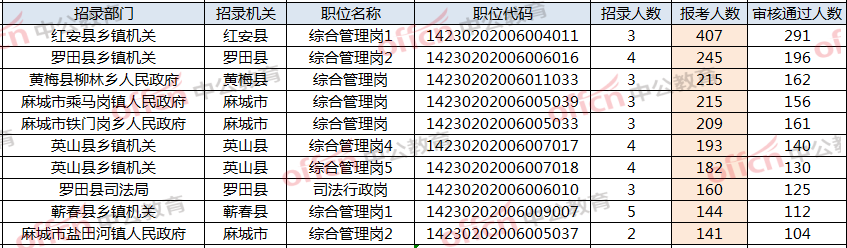 截止2月24日16:00,红安县综合管理岗1的报考人数已达407人,共招聘人数3人。其次是罗田县综合管理岗2的报考人数已达245人,共招聘人数4人。可以说竞争非常激烈了。