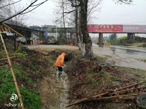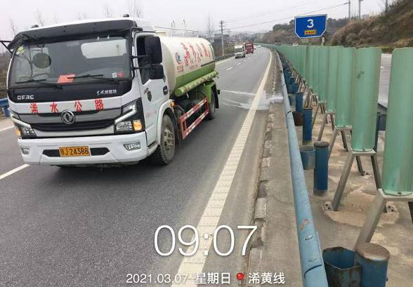 浠水县公路管理局每天出动40余名养护职工,1台洒水车, 2 台清扫车,8台养护作业车,洒水治理扬尘80公里,机械清扫路面110公里,清理边沟1160米,清理隔离带300米,清理路面积沙550米,在省道松兰线植树挖坑6公里,维修标志牌1处,雨天安全巡查180余公里。