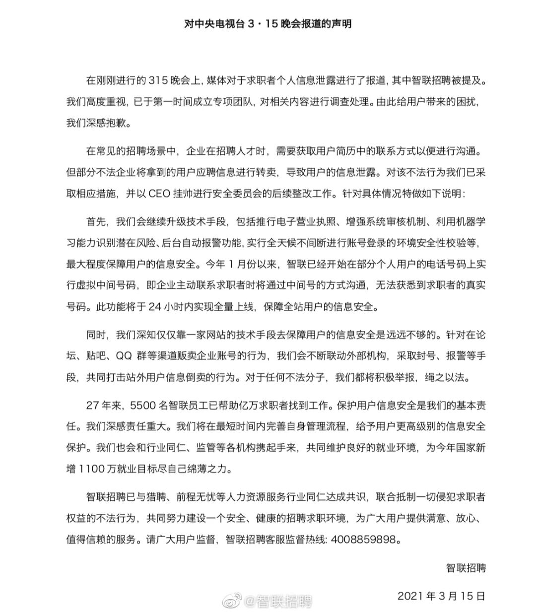 央视“3·15”晚会曝光招聘平台简历被售卖问题后,猎聘、前程无忧、智联招聘相继在深夜公开道歉。