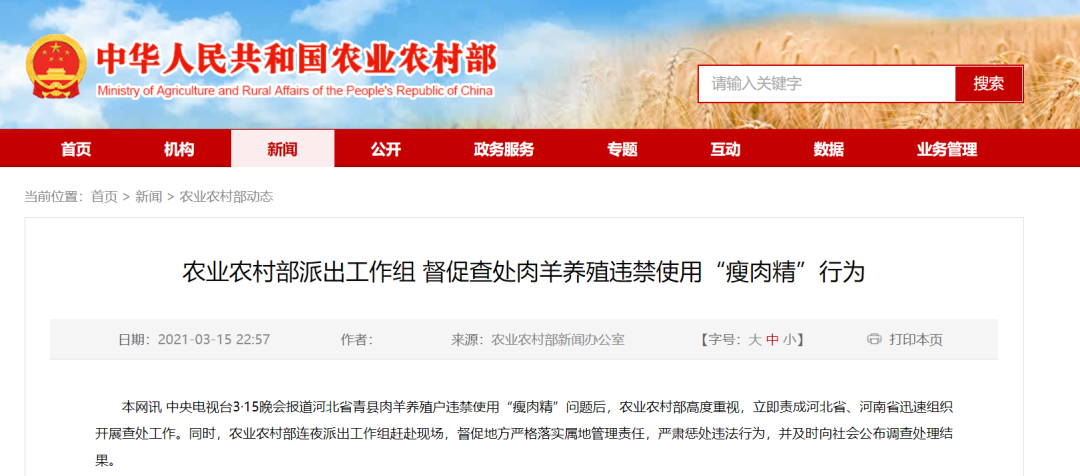 央视315晚会报道河北省青县肉羊养殖户违禁使用“瘦肉精”问题后,农业农村部高度重视,立即责成河北省、河南省迅速组织开展查处工作。同时,农业农村部连夜派出工作组赶赴现场,督促地方严格落实属地管理责任,严肃惩处违法行为,并及时向社会公布调查处理结果。