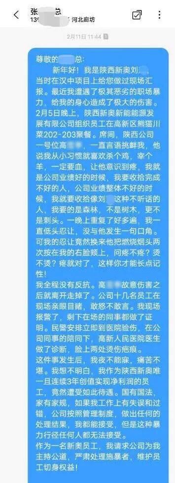 近日,陕西某能源公司员工刘尧(化名)便在网络上举报,因业绩差,自己在今年2月5日时,遭遇该公司“一号位”高华(化名)的“侮辱性惩罚”:“两次把燃烧的烟头按到我脸上,烫了两个伤疤扬长而去,并称疼才能长记性”。