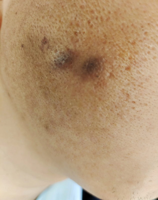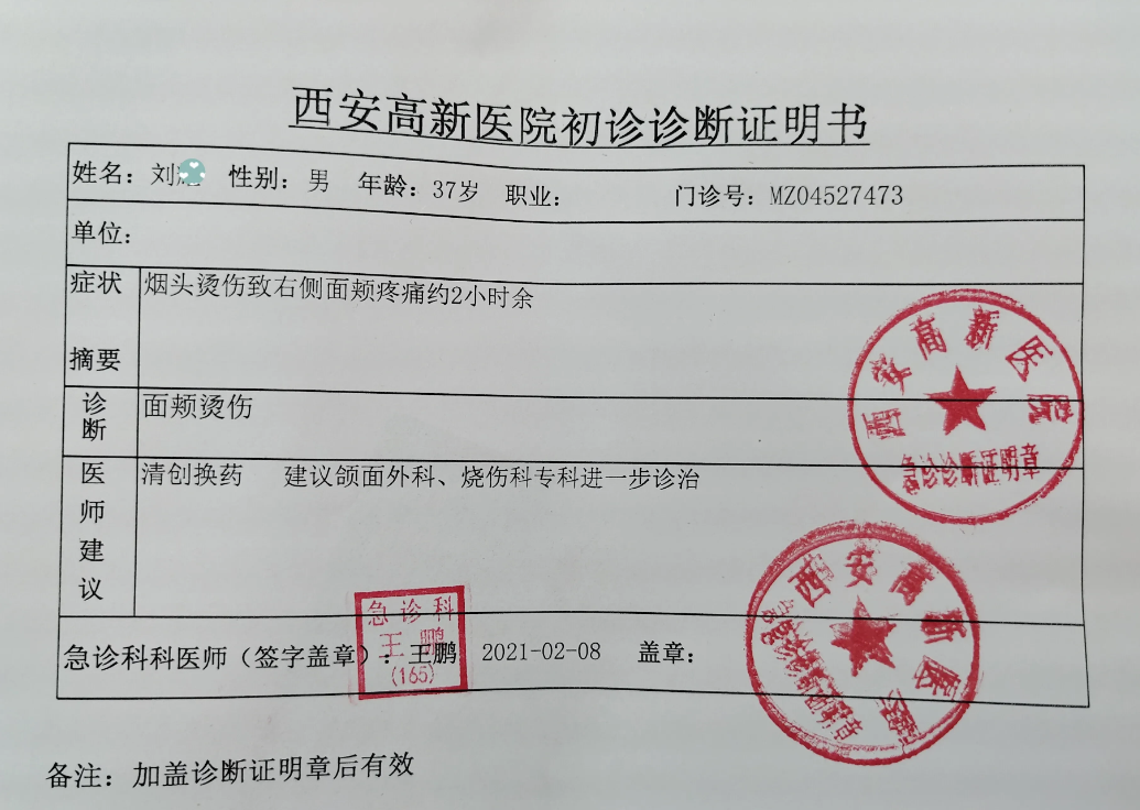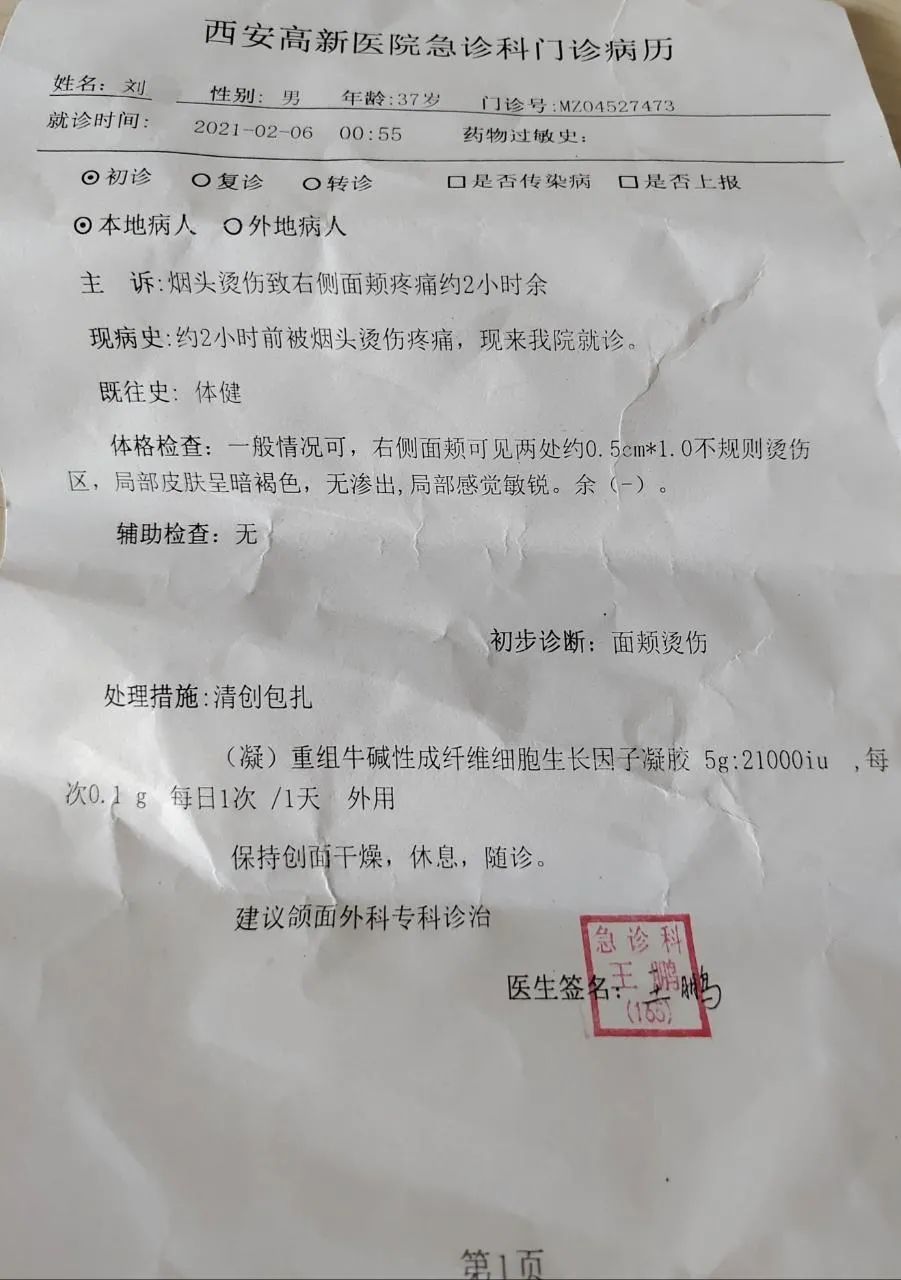 刘尧提供给记者的西安高新医院的急诊病历显示,病人“烟头烫伤致右侧面颊疼痛2小时”,其提供的照片可以看出,其右侧脸颊可见两处不规则烫伤。刘尧表示,伤势已有所恢复,但仍有疤痕,医美人士称疤痕可以减淡但无法确保消失。