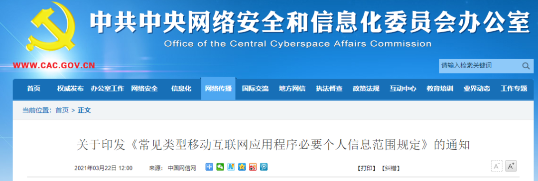 据“网信中国”22日消息,国家互联网信息办公室等四部门联合印发《常见类型移动互联网应用程序必要个人信息范围规定》,自5月1日起施行。