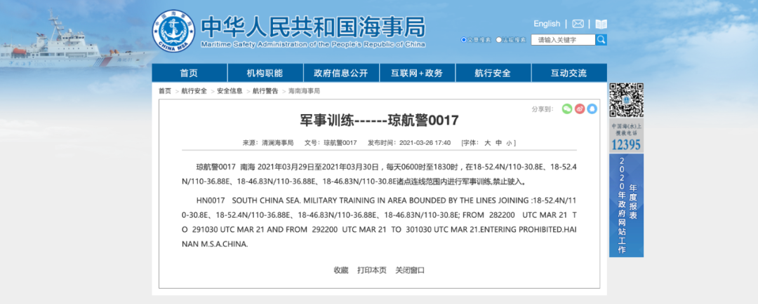 中国海事局26日消息,3月29日至3月30日,每天6时至18时30分,南海部分海域进行军事训练,禁止驶入。