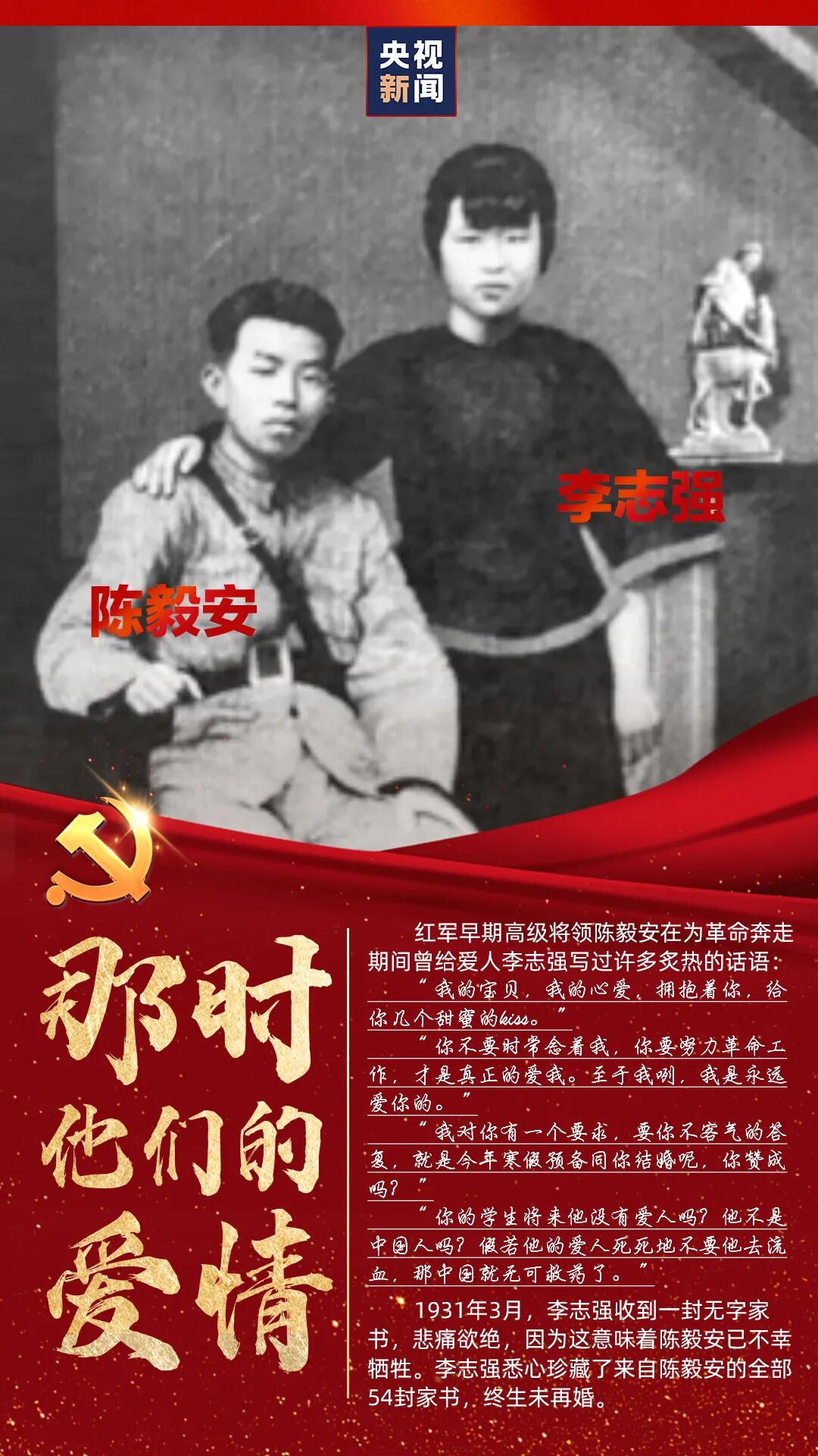 爱情是什么?万千个人也许会有万千种答案。中国共产党走过百年历程,许多先辈也曾在金子般的年华里遇到过最美好的爱情。在烽火硝烟、生死考验面前,他们如何抉择?又如何诠释“忠诚”?央视新闻推出专栏《那时他们的爱情》,记录一代又一代中共党员爱的誓言。
