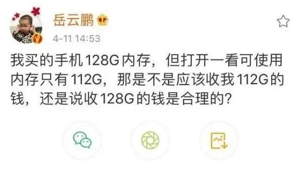 最近,相声演员岳云鹏发微博称自己买了128G内存的手机,但使用时发现,内存只有112G。他进一步追问:“是不是应该收我112G的钱,还是说收128G的钱,是合理的?”