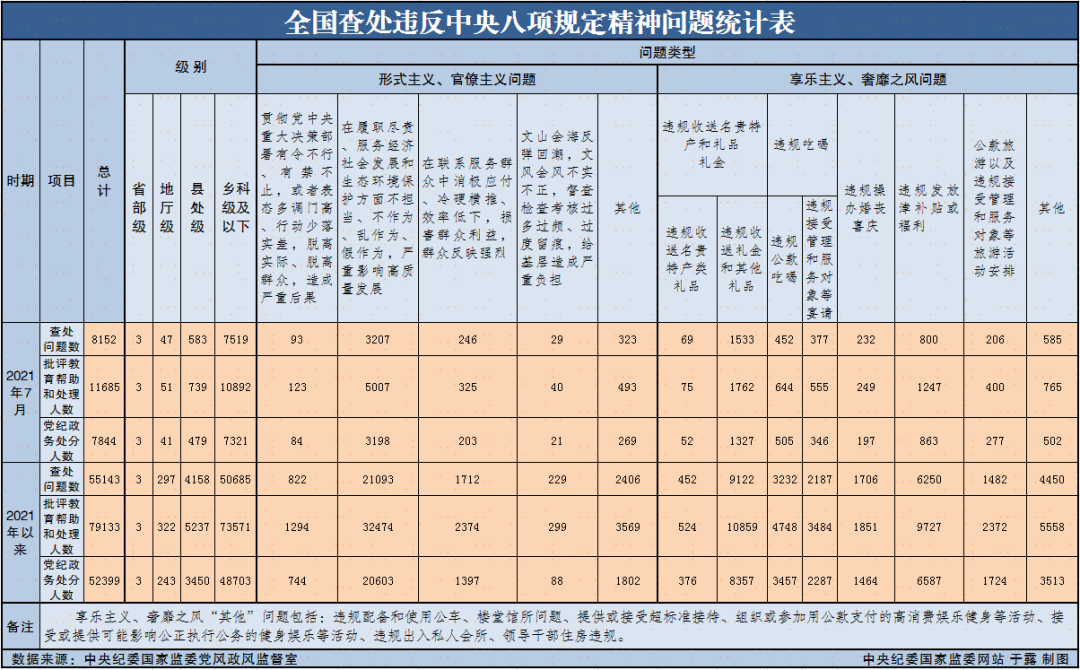 8月26日,中央纪委国家监委公布了2021年7月全国查处违反中央八项规定精神问题汇总情况。当月,全国各级纪检监察机关共查处违反中央八项规定精神问题8152起,批评教育帮助和处理11685人,其中党纪政务处分7844人。