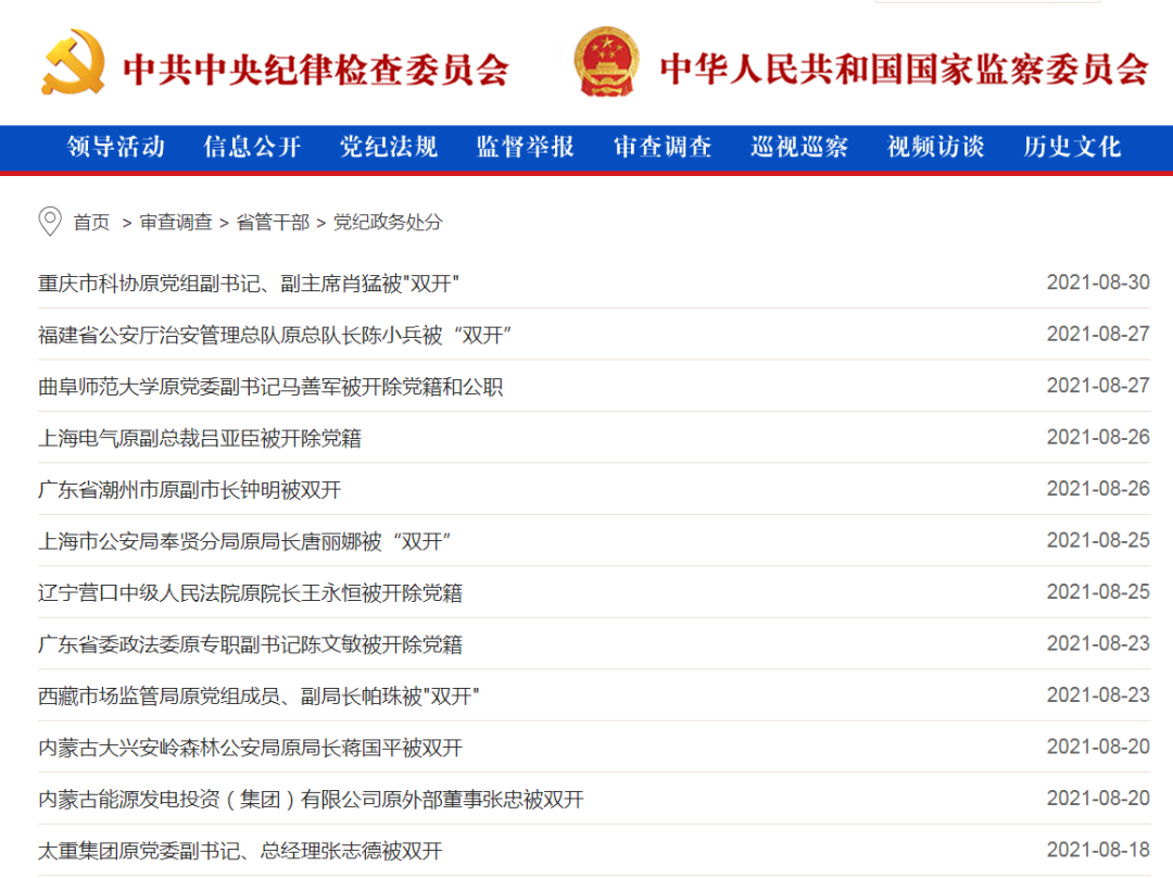 上海市奉贤区原副区长,市公安局奉贤分局原党委书记、局长唐丽娜严重违纪违法被“双开”;重庆市供销合作社原党委书记、主任梁从友被开除党籍;福建省公安厅治安管理总队原总队长陈小兵严重违纪违法被“双开”,等等。