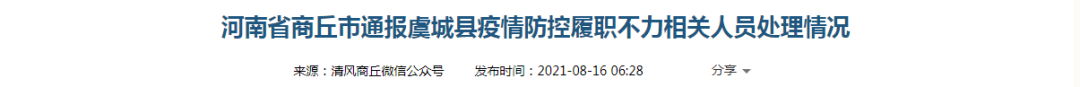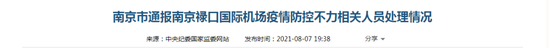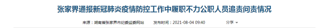 7月以来,南京、扬州等地相继暴发聚集性疫情。在疫情发生和处置过程中,个别地方和部门常态化疫情防控工作存在薄弱环节,多名党员领导干部因疫情防控不力被追责问责。如,2021年8月3日,张家界市纪委监委对新冠肺炎疫情防控工作中履职不力公职人员追责问责,永定区疾控中心党支部书记王铸等18名党员干部和公职人员受到处理;8月7日,江苏省纪委监委、南京市分别通报南京禄口国际机场疫情防控不力问责情况,南京市副市长胡万进,南京市卫健委党委书记、主任方中友等15名党员干部和公职人员被追责问责,等等。