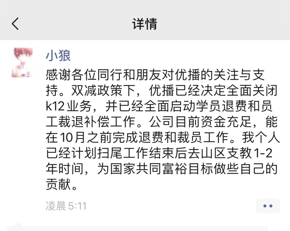 9月13日,新东方在线副总裁、东方优播CEO朱宇在微信朋友圈发文,表示新东方在线旗下东方优播已决定全面关闭K12业务,并已经全面启动学员退费和员工裁退补偿工作。新东方在线目前资金充足,能在10月之前完成退费和裁员工作。
