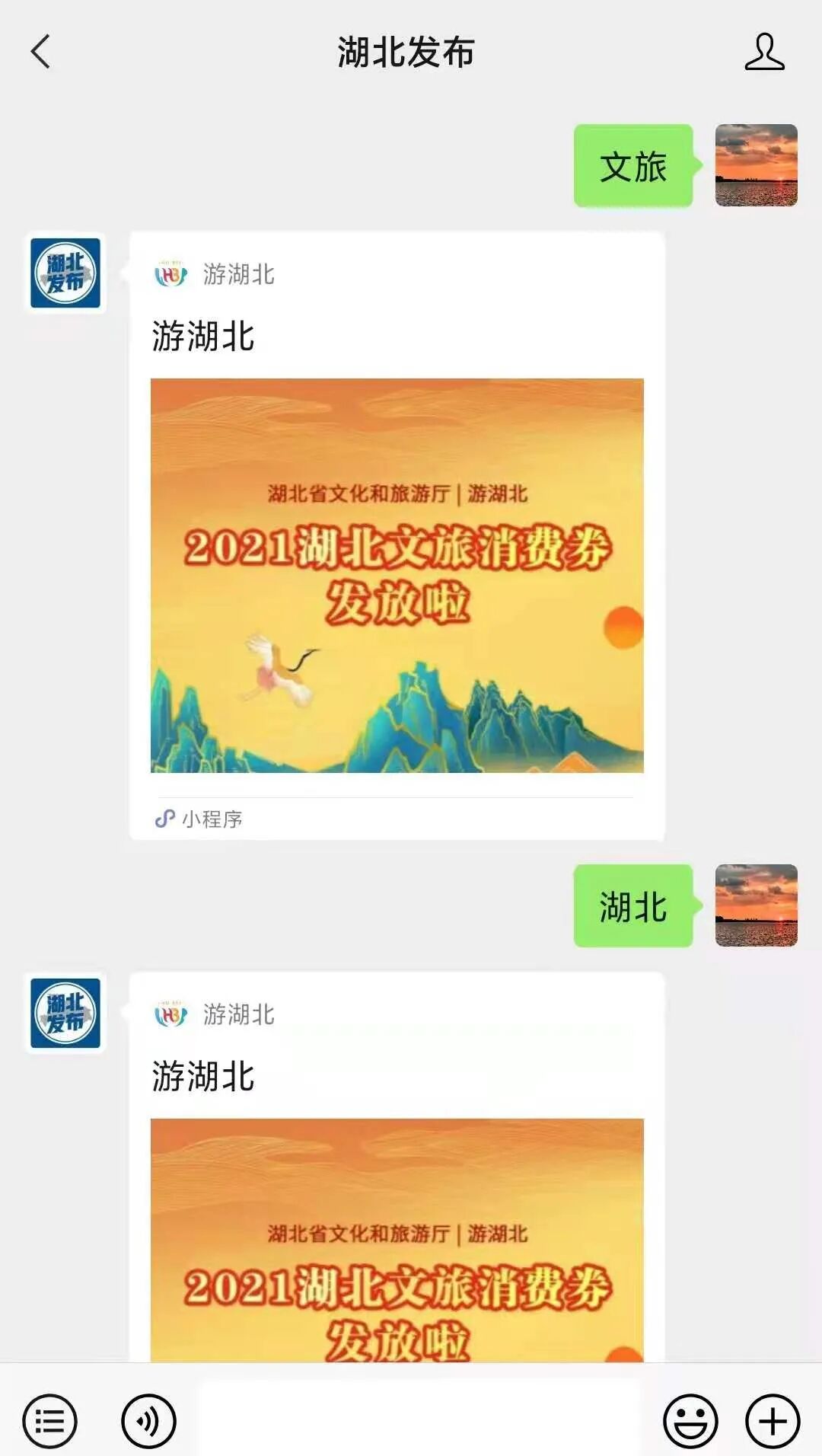 2.在对话框输入“湖北”、“文旅”“文旅消费券”任一关键词即可获取“游湖北”小程序链接点击即可进入
