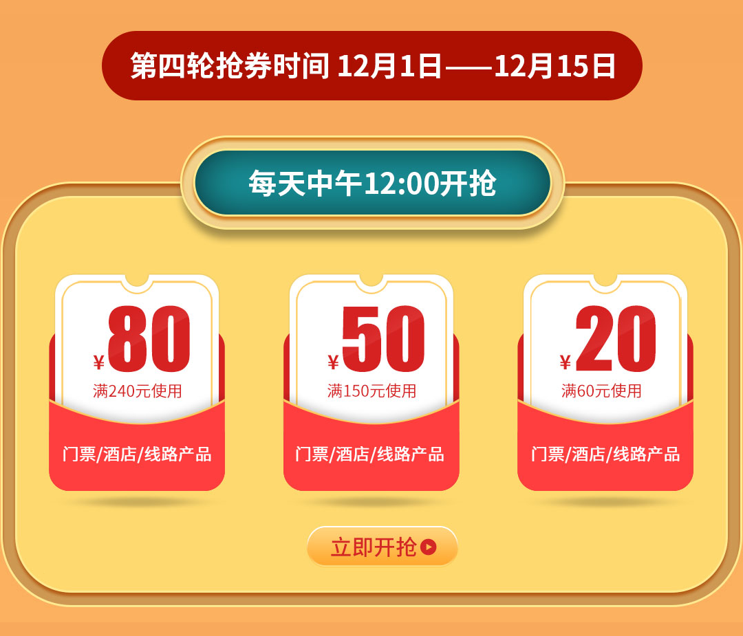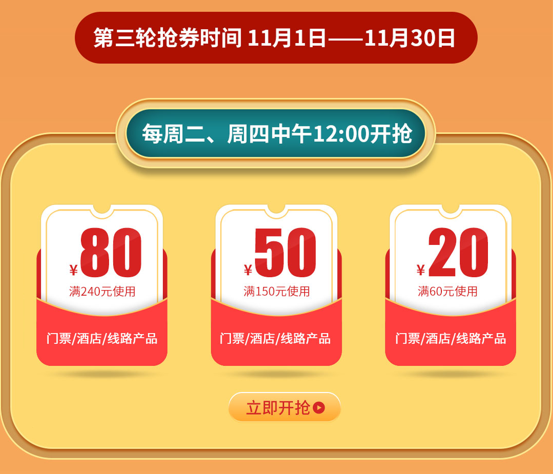 在湖北发布后台,通过「游湖北」小程序内的平台专区,购买门票、酒店、线路等品类使用,分为80元券、50元券、20元券。
