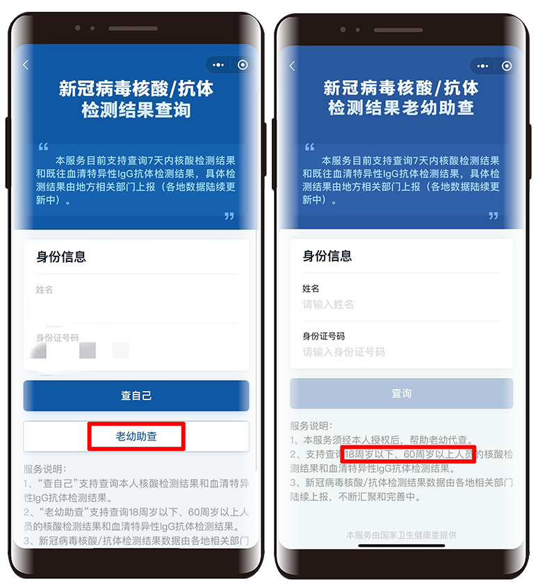 扫码进入【新冠病毒核酸/抗体检测结果查询】服务,只要有姓名、身份证号,可以【查自己】,也能查18周岁以下、60周岁以上的人员,【老幼助查】不要太方便!