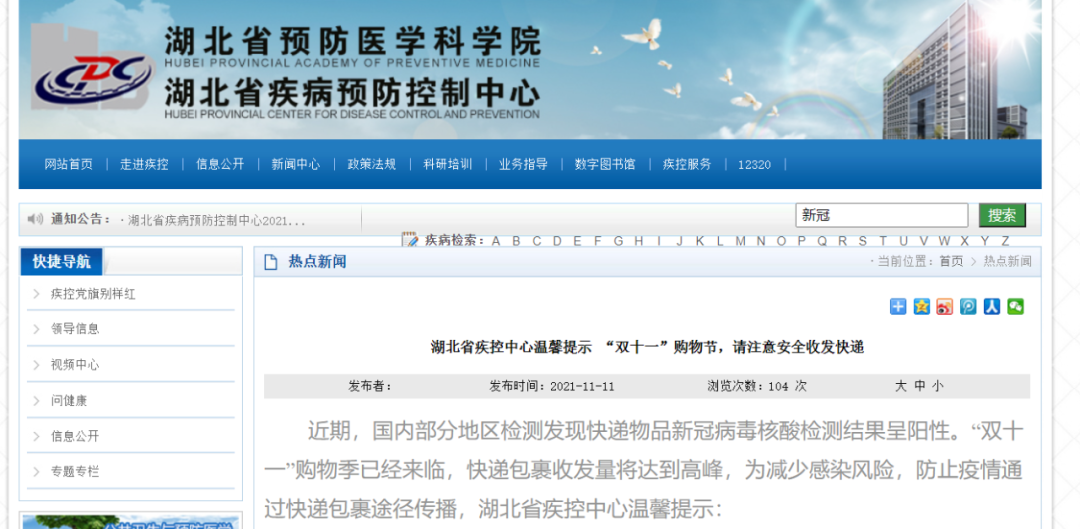 近期,国内部分地区检测发现快递物品新冠病毒核酸检测结果呈阳性。“双十一”购物季,快递包裹收发量将达到高峰,为减少感染风险,防止疫情通过快递包裹途径传播,湖北省疾控中心温馨提示: